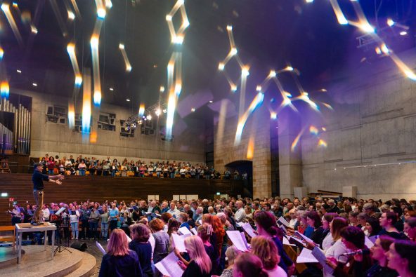 Seit dem 16. September treffen sich wieder Sopräne, Altos, Tenöre und Bässe am Dienstag in der Friedenskirche. Unser Advents-Projekt “Worthy” hat mit einer rappelvollen Friedenskirche gestartet. Druckfrische Songbooks werden gespannt durchgeblättert auf der Suche nach Bekanntem. Menschen herzlich umarmt nach einer langen Sommerpause. Die traditionellen Willkommensbrezeln schnell noch gevespert, bis es los geht. Egal ob alter Hase oder Neueinsteiger, unser Willkommen-Team ist für alle Fragen da. Um 19.30 Uhr erklingt ein beeindruckender Klangteppich der über 600 Sängerinnen und Sängern. Wir freuen uns sehr auf die Proben in der Herbst- und Winterzeit, die in Konzerte am ersten Adventswochenende in der Friedens- und Heilandskirche sowie am 23.12 im Beethovensaal der Liederhalle münden.